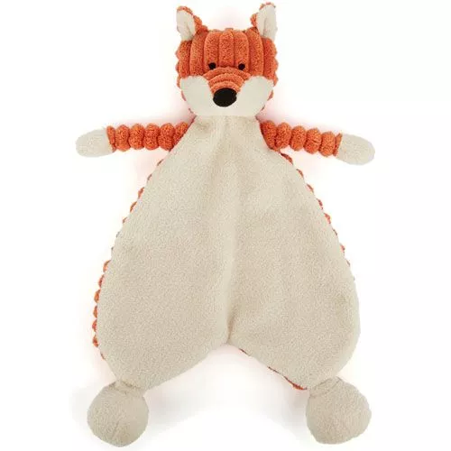 Deze Baby Cordy Roy Fox Soother van het Engelse merk Jellycat is een vrolijk vossen-knuffeldoekje voor kleine baby’s. Het vosje heeft in zijn snuitje geborduurde oogjes en een zwart neusje. Het roest-oranje lijfje van de tut is van een ribfluweel. Pootjes zijn weer van zachte krullerige stof, evenals de buik van de vos. De 2 verschillende texturen zijn verrassend voor kleine zoekende kinderknuisjes. Zijn kopje is heerlijk om in te knijpen.