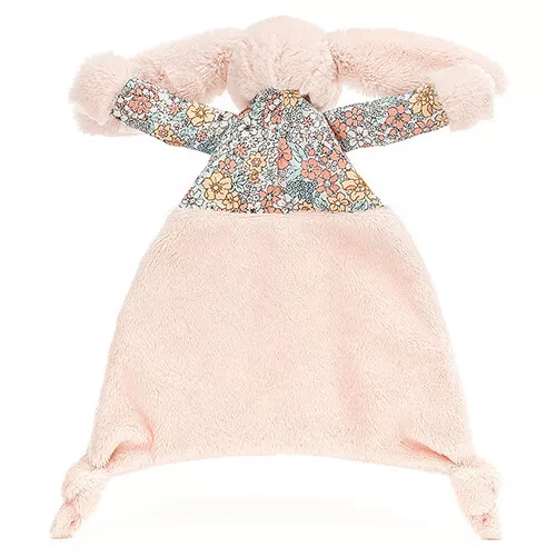 Deze Blossom Blush Bunny Comforter van het Engelse merk Jellycat is een vrolijk konijnen-knuffeldoekje voor kleine baby’s. Het knuffelkonijntje heeft een geborduurd snuitje en een roze neusje. Het bovenlichaam van het konijn is bekleed met een bloemenstof.