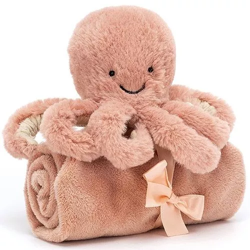 Deze ‘Odell Octopus Soother’ van het Engelse merk Jellycat is een onweerstaanbaar knuffeldoekje voor kleine baby’s. Het doekje lijkt te worden vastgehouden door een olijke knuffeloctopus met luxe, fluweelzachte vacht en acht gekrulde, elastische tentakels, die aan de onderkant van fijn corduroy vervaardigd zijn. Het zalmroze babydoekje is van dezelfde fluweelzachte stof als de octopus, maar iets gladder. Het hoofd en lichaam van de speelgoedoctopus zijn heerlijk zacht om in te knijpen.