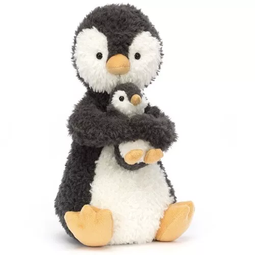 Moederpinguïn houdt haar baby beschermend vast. De ‘Huddles Penguin’ van het Engelse merk Jellycat is een liefdevolle knuffel voor kleine kinderen.