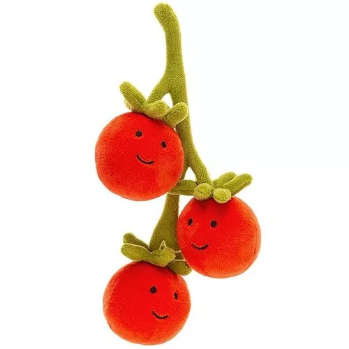 ‘Vivacious Vegetable Tomato’ van het Engelse merk Jellycat zijn gezellige knuffeltomaten, vastzittend aan een groene steel. Met vertederende glimlachjes en zwarte oogjes is dit zachte knuffeltrosje een kleine supervrucht. Kinderen lopen weg met deze trostomaatjes!