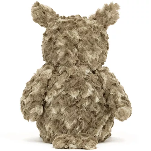 De slaperige knuffeluil ‘Oberon Owl’ van het Engelse merk Jellycat kan nauwelijks zijn zwarte kraalogen openhouden. Zijn vleugels, buik en zijn wollige verenpak zijn heerlijk zacht en zijn grote wenkbrauwen geven hem een eigenaardige uitstraling. Zijn oogleden, snavel en pootjes zijn van suède. De speelgoedvogel staat op het punt om weer een uiltje te knappen.